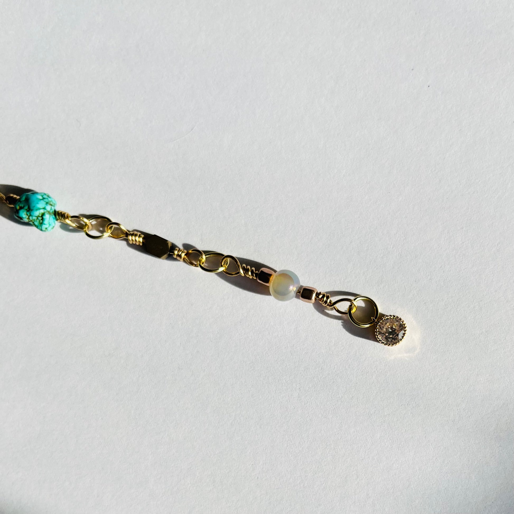Short: 14K Gold Filled wire wrapped, Turquoise, Hematite, Smoky Aura Quartz and, Cubic Zirconia  [aprx. 5.5"]