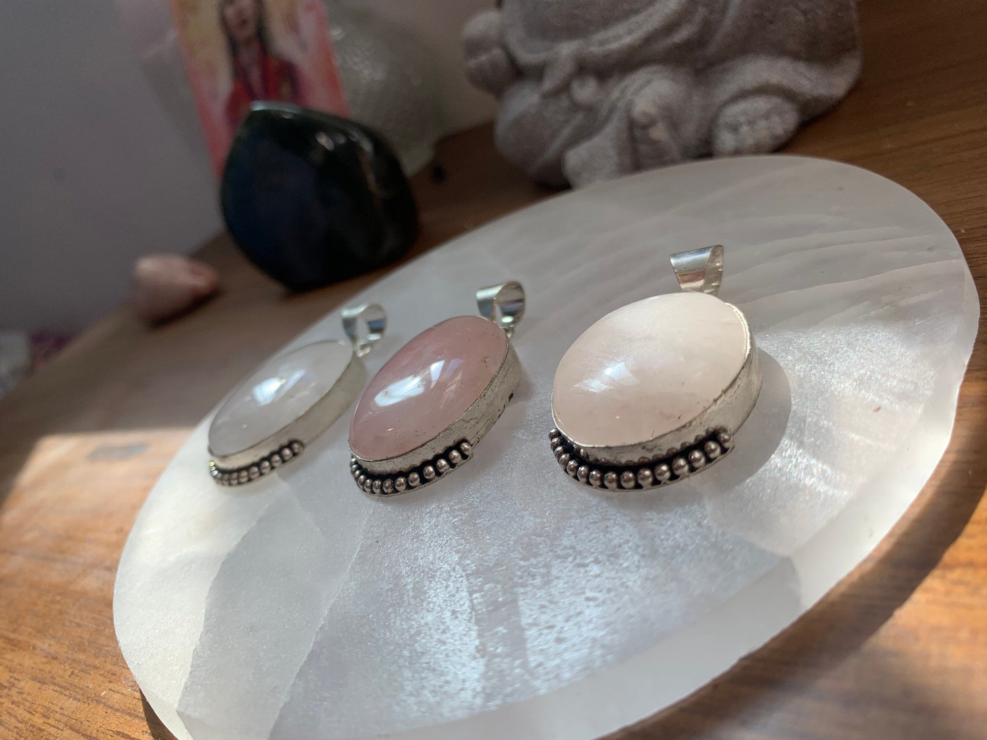 These beautiful Rose Quartz pendants are handmade in India. Each piece is a one of a kind natural stone/crystal.